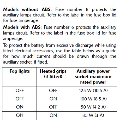 | | Posted : 17 Sep 2010 - 13:08 Post title : Re: Overloading the electrical system (Re: davetac1) | | | Here's a chart that can be found in the instructions for either the Aux lights or heated hand grips that provides load information for those accessories: