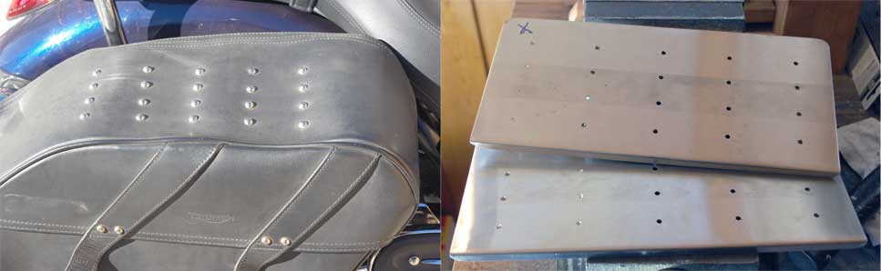 First attempt at fixing warped/sagging lids (and saving my $700US bags) was to try riveting a metal plate inside lids thru plastic liner and leather (left pic). Used round-head rivets matching Triumph's and punched/drilled 20 holes per lid. Helped some, but not much and not for long. The plastic liner warps when heated (melts like wax at relatively low temp), taking leather with it in waves. Miserable material, whatever that plastic is..... (Plus, I think some cow might've tried to sit on this one, which didn't help any - but THAT won't happen again ;-) Right pic shows new stainless plates almost finished, to be installed (below).