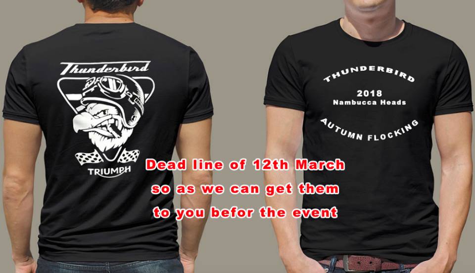 | | Posted : 09 Mar 2018 - 10:37 Post title : Re: 2018 NSW Mid North Coast Flocking (TB1600) (Re: stevew) | | | Hi everyone, 2018 Aussie Autumn Flocking tee shirts are available as posted in the fb 2018 Aussie Autumn Flocking page. 12th March is the dead line as the tees have to be printed and posted to you. Sorry for the short notice on this one, but the original supplier has printing issues and we are lucky to have the print of shirts go ahead.