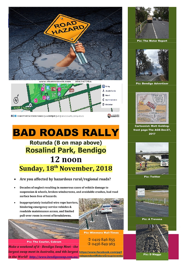 | | Posted : 27 Oct 2018 - 08:30 Post title : Australia, Central Victoria - Bad Roads Rally, Bendigo - Sunday, 18th November, 2018 | | | Bad Roads Rally flyer . . . please do not print this out! Email for .pdf version to print out as A4 flyer or A3 posters, as .jpg here is poor print quality. Greyscale/b&w also available for A4 flyers to leave on counters, in letterboxes, hand out etc. Thanks, Cate independentridersgroup@iinet.net.au