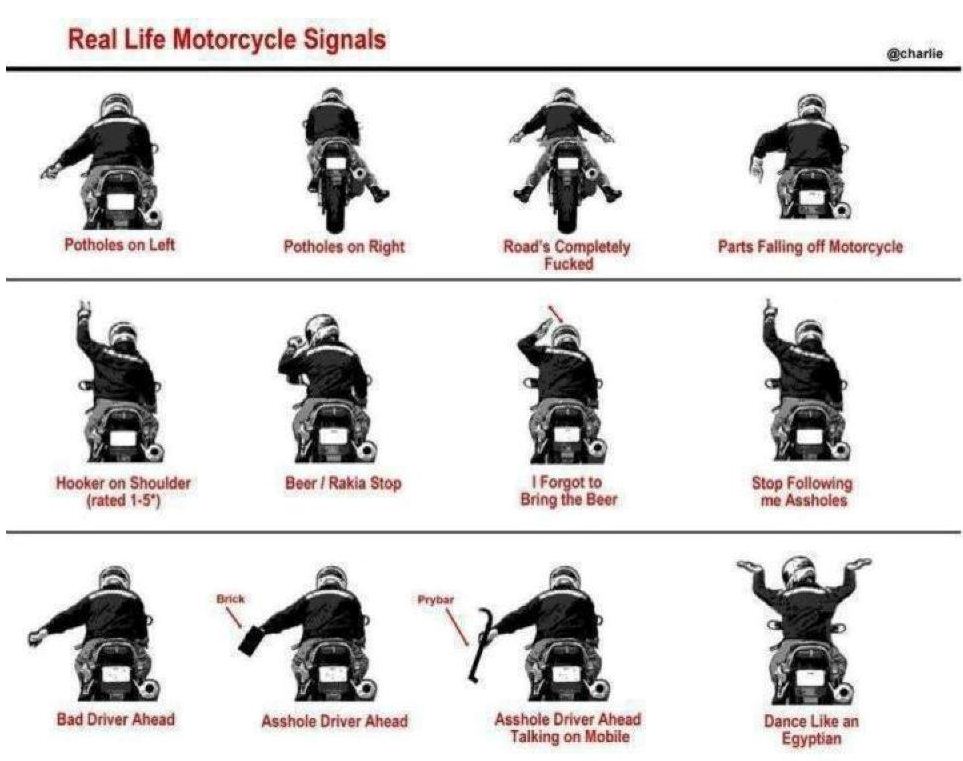 | | Posted : 07 Apr 2014 - 11:51 Post title : Re: Just plain embarrassing.... (Re: satch1961) | | | Slow down cop ahead signal is tapping the top of your helmet with your left hand.