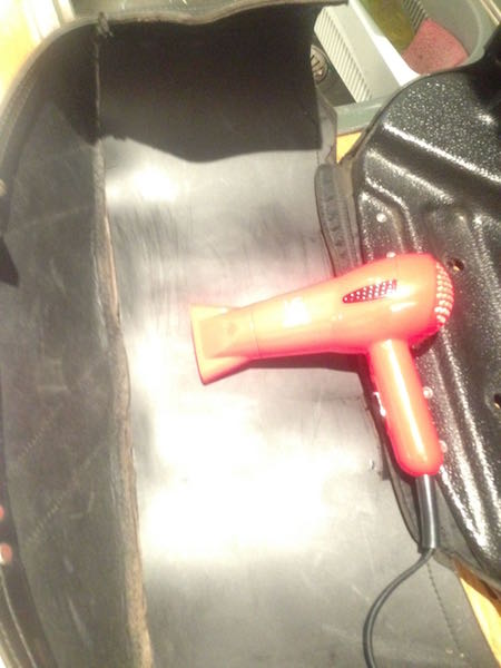 First of all i cut the two leather straps underneath the lid of the bags - and then using my favourite hair dryer I heated the plastic lid liner to enable the re shaping of the plastic - and have to say after the first attempt it looked a lot better I used a metal cup while the plastic was hot - and reshaped it