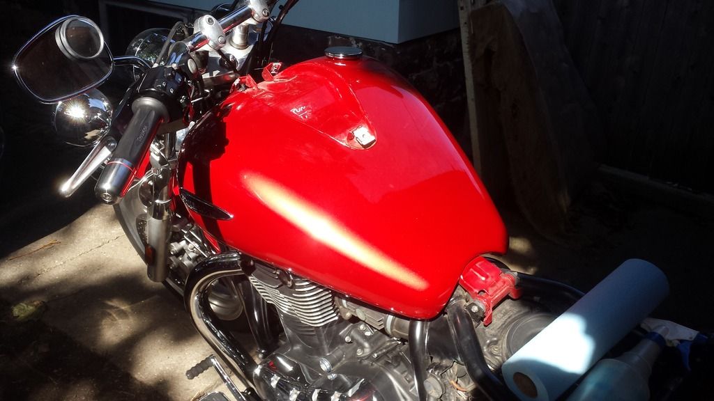Here's the finished product. This was my first attempt at this and I made some mistakes. You can't be too clean. I have a couple of dirt specks that found their way in and I didn't notice them until late in the game. Also, I wanted the film to extend under the tank and around the back corners. I think those curves are more than the film can manage. The under side of the tank didn't come out too good. I'm not sure how to trim it other than to redo the whole thing. Overall, I'm happy given the price. It wasn't really hard other than determining where to end the cuts. I can now use my magnetic tank bag without worrying about scratches. This took me about 4 hours from start to finish. Not bad.