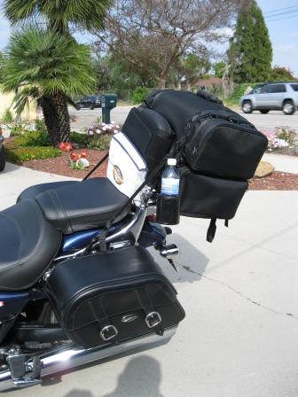 | | Posted : 29 Apr 2011 - 19:33 Post title : Re: Luggage. (Re: Buzzo) | | | That is one thing I like about the TB compared to the America, I can strip it down most of the time. Got this Kuraykyn bag from Fast Eddy. Used it on the trip to Las Vegas, it is big but no problems. To connect it to the Easy Brackets, I just used 1" rings on the front post. The white bag is a down pillow cover, but the wife uses it to either sit on or as a lower back rest.
