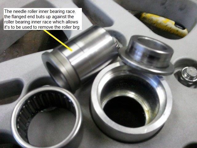 The 'inner'sealed bearing removed which allows the removal of the needle roller inner bearing race so that you can clean and inspect the bearing.