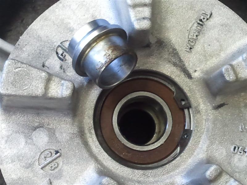 This is the 'inner' bearing spacer. Notice signs of rusting.+ you can see the inner race of the outer needle roller bearing against the roller bearing inner race.First remove this circlip. This picture depicts the Needle Roller Bearing and Inner race which actually sits up against the Roller Bearing inner race. This photo shows the inner race of the needle roller protruding level with the drive pully outer seal + the Stepped Socket and Extension to be used as a drift to remove the inner roller bearing via the inner needle roller race.This is so you dont damage the inner needle roller bearing race. Depicting the Stepped Scoket & Extension to be used as a drift tool.