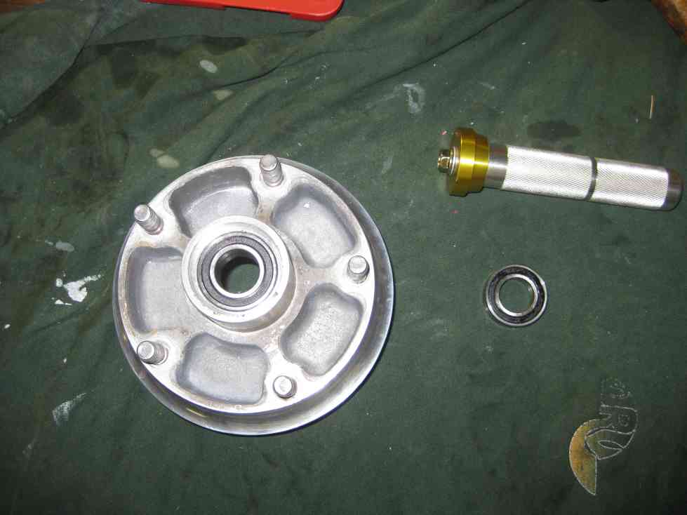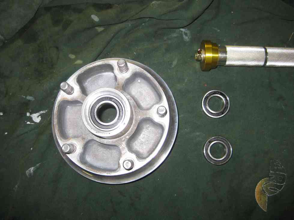Here are some pictures of the spindle with the bearings going in. It cost me about $40 US to have the new center spacer made out of stainless and another $30 for the bearings. You will have to figure in some seals and stock bearings if you damage them on removal.