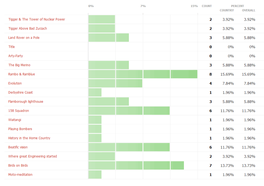 | | Posted : 20 Mar 2012 - 06:37 Post title : Re: March 12 Photo Scavenger Hunt Vote (Re: Ninox_s) | | | Thatch wrote: It was a close one though with lots of pictures gathering broad attention and we had 51 total entries which I thought was pretty good. Here is a break down of the votes. |