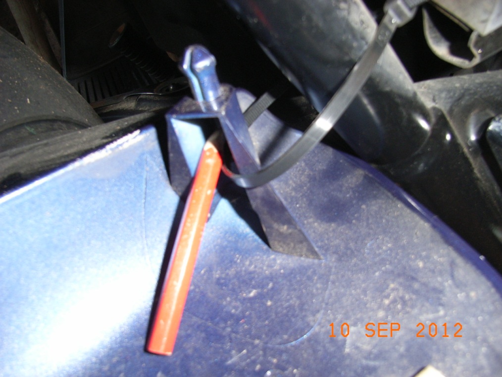 | | Posted : 09 Sep 2012 - 20:29 Post title : How to retain your side cover against loss or theft | | | As we all know ,the side covers are very expensive for the Thunderbird,I have come up with a quick solution to guard against accidental loss ( blown off in the wind) or theft. When you pop the sidecover off there is a slot at the base of the retaining plug that clips into the rubber grommet type thing,you just thread a black zip tie through the slot and around the frame tube ,tighten it up untill it has enough play to slide up and down the frame tube when off ,cut off the excess ,re-install and your finished.The photo shows the slot at the pencil point,all up will take you about 1 minute each side and you no longer have to worry about losing one.