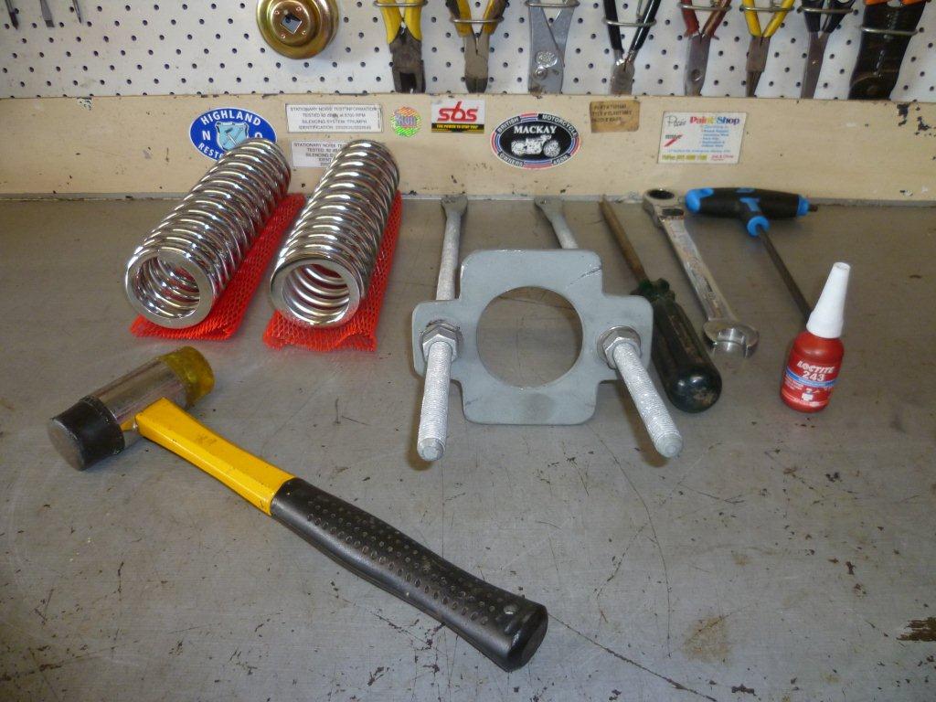 To Change the Springs you need the following tools. Home Made Spring Compressor ( to suit the Ikon SP8 ) or some other means of compressing the shockabsorber spring. A 6mm Hex Driver, A 13mm Ratched Ring & Open End Spanner for the spring compressor, A Soft Hammer, A Old Phillips Screwdriver ( They are made of good material for the spring compressor anchor) Loctite 243 Thread Lock or Similar,