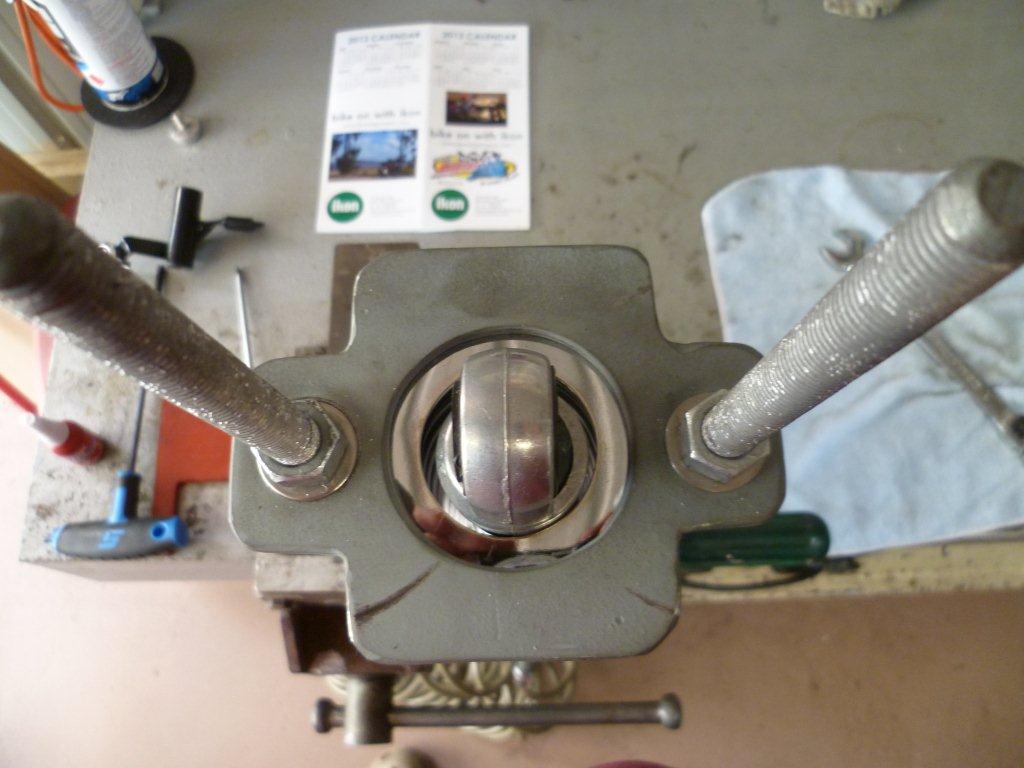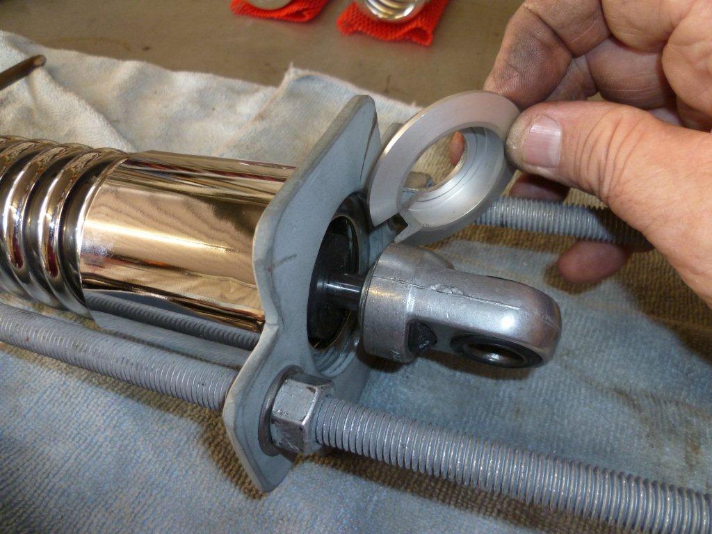 Step4: Place the complete shockabsorber in the spring compressor as depicted below. Step5: Tension the spring compressor bolts down approximately 55 to 60mm or enough to allow for the top retaining collet to come clear of the shockabsorber head Step6: Remove the top collet and then loosen off the spring compressor bolts enough to allow dissambly of the shockabsorber In this case the Spring that are being changed are from a Code 608 on the Left to a Slightly Lighter Code 514 on the Right. if you look carefully you will notice there is a slight difference in the winding of the springs and a slight difference in the winding at the bottom of the photo. Step7: The next step is relatively easy and is more or less the reversal of taking things apart, except that you must ensure that everything is reassembled in the correct order and that the tightly wound portion of the spring goes to the top under the chrome schroud.Once everything is assembled and back in the spring compressor double check the top to ensure that everything is concentric at the top before you start to recompress the spring to enable you to refit the retaining collet. Refitting the retainer collet. The retaining collet in place. Step8: Once the retaining collet is in place start to loosen off the spring compressor ensuring that the collet slips snugly back into the locked in position around top anchor point.When it is in place completly loosen of the spring compressor and remove the reassembled shock, which is now ready for refittting to the bike. Step9: The final thing is to refit the shockabsorber to the bike and at the same time applying a couple of drops of Loctite Thread Locker to the retaining bolts, and finally tension all retaining bolts to 25-28Nm or 18-20 Ft Lbs