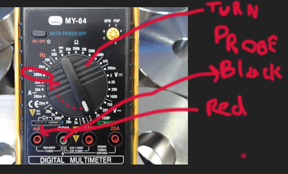 | | Posted : 04 May 2013 - 09:48 Post title : Re: How to use a Multimeter (Re: mat1600) | | | Don't use the 20 A position mat, this is for high current readings of up to 20A. The mA position will be fine for this measurement, more accurate as well.