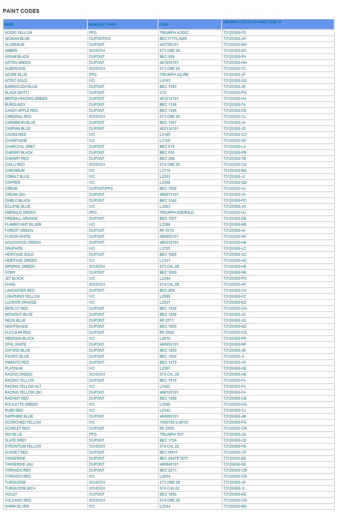 MotorMac photo album - Triumph Paint Codes