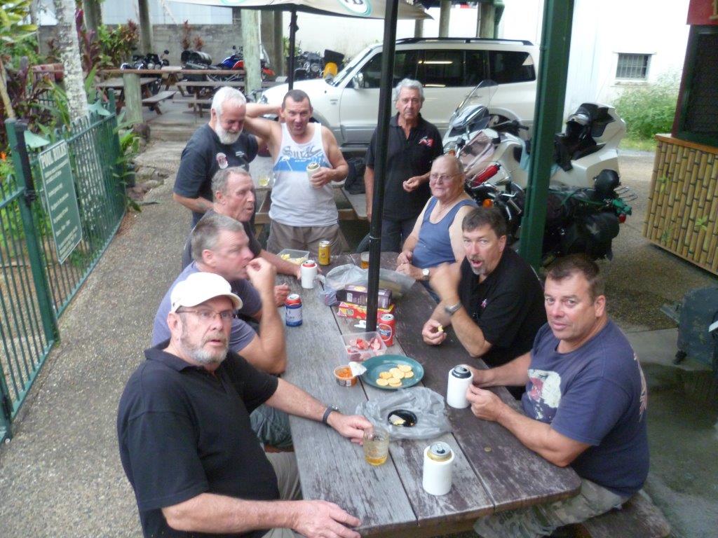 Day1: Saturday May11th: Mackay to Cardwell.560Klms The ride got underway at approx 8.30am from the Shell Norside Service Station with12 riders leaving Mackay and on this day Bob was the lead rider for the day and Jim Schibrowski had volunteered to go Tail End Charlie for the complete ride as Jim is an accredited first aider. Our first scheduled stop was at Proserpine under the trees adjacent to the BP Service Station for a leg break,It should be noted that the refuelling stops for this complete ride were all based on the fuel capacity of the Bonneville's on the ride and this was explained at the pre ride meeting as they have a ride distance before reserve of around 240klms so it was planned that way to ensured they refuelled at or around the 200 to 210/200 Klm mark. It was then onto the Caltex Roadhouse at Bowen for our first refuelling and refreshment stop.With this out of the way it was then off to Townsville for our next refuel and lunch break, Or should I say towards Townsville for all riders except for one who thought He might make a detour into Bowen for no particular reason ?? Errrrrrrrragh, This caused a bit of a scurry for the Myself and Andy & Jim as we had to go looking for him into Bowen,Once we had him in line it was then off after the main group and we literally "Rode Our Arses Off" finally catching them up approximately half way to Home Hill at Guthalungra,We then rode into Ayr with a few people topping up with fuel and having another leg stretch before we carried onto our scheduled refuelling stop at the Woolworths Caltex Servo at Cluden just south of the Townsville ring road entry point where most riders filled up,with that out of the way we then found our way to Lloyd Dornbuschs daughters residence in Townsville where Lloyd, Maurie & Sue had prepared lunch and refreshment for us.After stopping there for just over an hour we then headed out towards Ingham and then finally onto our first overnight stay at Cardwell where we arrived at 4.30pm and were joined by Lloyd Harmsworth who had a late departure from Mackay and finally caught up at the road works road block at the bottom of the Cardwell Range.The amount of work being done on the Cardwell range is really astounding and will be really great when it is finished supposedly later this year.We stopped at the Beach Side Motel which proved to be an excellent choice of accommodation as the Owners treated us like royalty and nothing was too much problem with all bike secured under the Foyer of the Motel they also provided an area just outside where we could enjoy some refreshments and nibblies from Lloyds Support Trailer before catching a courtesy bus down town to the Marine Hotel for dinner,So far the trip had been dry with any rain happening literally 5 minutes in front of us. The first nights pre dinner drinks at the Beach Front Motel in Cardwell, another Biker Friendly Establishment. Day2: Sunday May12th: Cardwell to Mossman.260Klms We departed Cardwell at around 8.30 and today Glen Bradley was the nominated lead rider for the day.and headed for our first planned stop in Cairns,However this was to be broken by a quick detour into a Roadhouse outside Innisfail for a few members to catch up on some breakfast,with that out of the way we headed to Cairns and once again escaped getting wet with the rain literally being blown ahead of us by no more that a minute or two,Once in Cairns we went around to the Harbour Pier Car Park for a break and look around where some members went for a wander through the Pier Shopping Centre and the adjacent wharfs area,Here we had a break of about 1 hour before heading out for our scheduled lunch break at The Ellis Beach Hotel, This proved to be a bit of a disaster as the group quickly got broken up by traffic lights and for some reason some couldn't read the road signs that said Mossman/Port Douglas, This was exaggerated by one member having a problem with some luggage coming adrift in the middle of the "Traffic Mayhem" and three of us having to back track about 2,5 klms to get back to where the luggage had come adrift and pick it up and resecure it to his bike, with that secure "We Three" then headed off to Ellis Beach after finding someone a bit keen on taking the road to Redlynch/Kuranda instead of Mossman/Port Douglas.When we arrived at Ellis Beach Lloyd had set up for lunch and to say the least there were some unhappy riders mainly due to the group getting fragmented by the intense traffic on the Cairns to Mossman/Port Douglas Highway. After lunch we headed off up the scenic coast ride to Port Douglas where we refuelled before heading onto Mossman for our next couple of nights accommodation, At this stop Bob's Harley made it's usual long ride announcement of a hugh backfire on start up which resulted in it blowing the Carby off the intake manifold, Bob was prepared for this and quickly had it back together with in about 15 minutes. We arrived at the Mossman Daintree Hotel at about 4pm. "Boy What a Grand Ol Pub!" the hospitality in this establishment was tremendous and a special thanks to Alf & Margret Zeller as they virtually gave a free run of the place and catered for all our need including preparing a night time BBQ which was ably controlled by our resident chef Lloyd D. A couple of guys also took the opportunity to do some washing as there was a Laundromat directly across the road from the hotel and a couple of nice cafes just down the street.