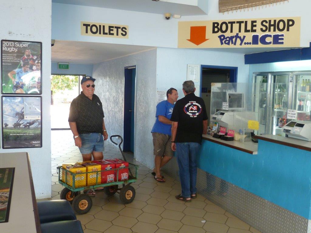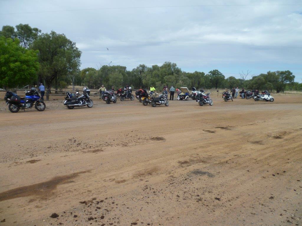 Feeding the mob at the Burke & Wills Roadhouse. After we had refuelled we then had some lunch before setting off on the next 230klms ride down the Wills Development Road to Julia Creek.This was to be a fairly interesting ride as the road was not what you would call a great outback road and was extremely undulating and at times fairly narrow with both wheel tracks sunken down only leaving the centre section to ride on, this caused some handling problems for the 2 Spyda's and the ride group had to slow down and subsequently got strung out over a much longer distance. Our next stop was at Sedan Dip Country Racecourse and Rodeo Complex which was about 140klms down the road as it was the only place that Glenn could find with any trees of and size that could provide some shade.After a 20minute stop and with 90klms to go the group headed off and it was about a kilometre down the road that we encountered our first tyre problem for the trip with Terry Vandenberg noticing that he was getting a flat rear tyre. Jim Schibrowski and Myself stopped to help and in the process gained some experience in plugging tubeless tyres as the first plug was inserted and they tyre was inflated with Swoosh Tyre Sealant in a pressurised can only to find out that we actually hadn't plugged the right hole as Terry had inserted the plug into an area of the tyre that we thought was the leak but had no leak.We quickly found the real problem and stuck another wick plug into it and with the aid of a couple of gas bottles we are able to get 20psi in the tyre which enabled us to continue with caution to Julia Creek.The main group arrived approximately 45minutes ahead of us and only just in time to refuel as the town had been out of petrol since 6am the previous morning. we have all heard about the "Pub with no beer" but the "Town Without Petrol" was a little different. I later found out the reason was that the supply ship that brings the unleaded fuel to Townsville had broken down and was late into port.