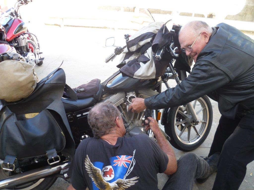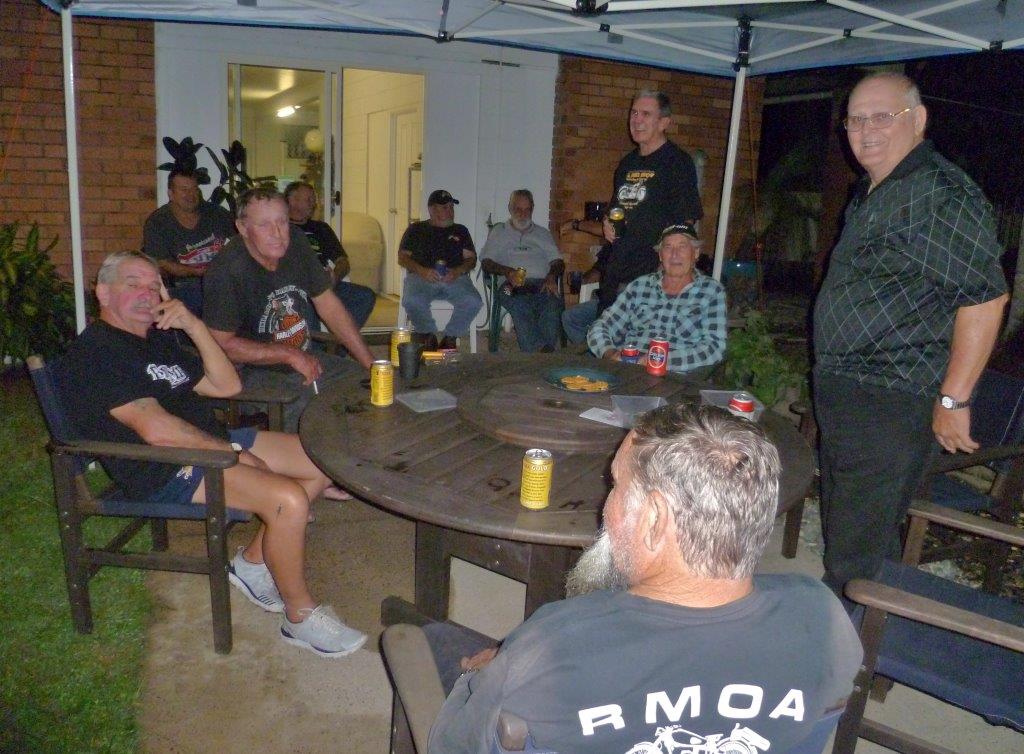Gerry D ( Triumph Thunderbird 1600) Glenn B (Triumph Adventurer) + 1924 Velocette, Max A ( BMW R1200R) + Owns a T100 Bonneville Bob I (Harley Davidson) + Owns a T100, A7 BSA, 1924 Douglas, C15 BSA, Matcheless, Lloyd H ( Triumph Thunderbird) + 1954 AJS Andy M ( Triumph Bonneville ) + 2 x T100's Bonneville's Bernard C (Triumph T100 ) + Royal Enfield Terry V ( Triumph Tiger) Alan C (Triumph Rocket 3) + Royal Enfield Lloyd D ( Spyda) + BSA Gold Star Maurie P ( Spyda ) + Royal Enfield Bruce H ( Triumph Bonneville) + BSA Lightning Jim S ( Suzuki V Strom)+ 2x T 120 Bonneville's Danny C ( Triumph Thunderbird 900 ) Lex Watson Yamaha Something or Other?? + 2 x Nortons