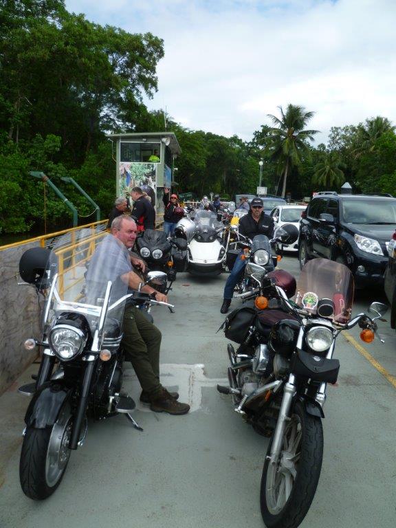 Having another ale and some nibblies at the end of a days ride. Day3: Monday May13th: Mossman Free Day & Cape Tribulation Side Ride 150Klms As today was a lay day we departed Mossman for the Daintree/Cape Tribulation area about 9am, This ride is of short duration but of a reasonably slow nature once you have crossed the Daintree River by barge ($5.00 Return Ticket).There are numerous tourist experiences available for river trips and the group actually did a short detour into the settlement of Daintree just for a look around on the way to the barge crossing. Once across the Daintree River it was onto Cape Tribulation and this was a very pleasant ride through the rainforest apart from the number of fairly severe speed bumps that have been put in the road every few hundred meters in some cases.The ride was definitely worth while but apart from the beach at Cape Tribulation there wasn't much else to see as 90% of the road is within the rainforest,On the return route the group made a planned detour into the Cow Bay Hotel for a look and a couple of drinks and for most this turned into a lunch break,with that break over we then headed back to Mossman with a small group heading over to Port Douglas for a look around and to have a lunch time meal as was previously planned. Lex also took the opportunity to get his new bike serviced by a local service agent during the afternoon break.