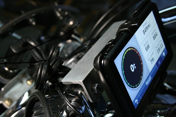 Garmin Nuvi GPS mounted on RAM holder with custom made bracket mounted to handlebar riser caps.