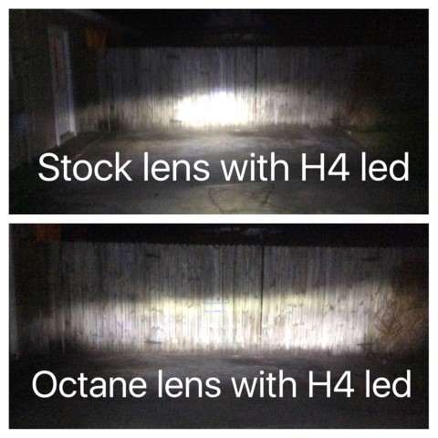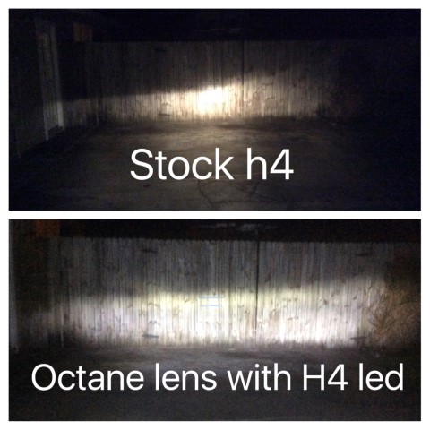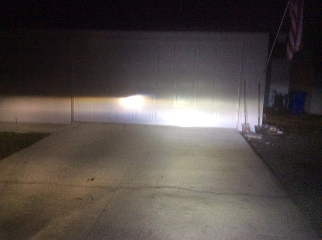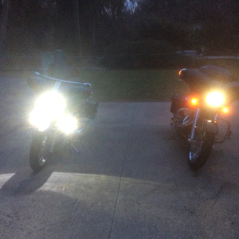 Oh yes and the Octane light has a led ring around it I wired to the running lights. They come in differnt colors and one can actually use them as turn signals with the Superwhite bulb it comes with. With Led in there I don't think you'd see them. There was some modification required. For this Octane light you will need to trim down the headlight ring about 1/8 inch all around. Picture below is HD with 7 " daymaker Evo 2 (Thank you Kerry for the help) next to the Tbird with my leds. Both are just on sidestand. Daymaker an obvious wide light band but very pleased for less than $120.00 with my results. I have a bunch of comparison pics but will take me a while to organize and resize the different things I tried. Have researched off and on and came to this as being an inexpensive solution to improved lighting over a near $500 daymaker. Next is us holding bikes up Front view. Yes you can see me coming.