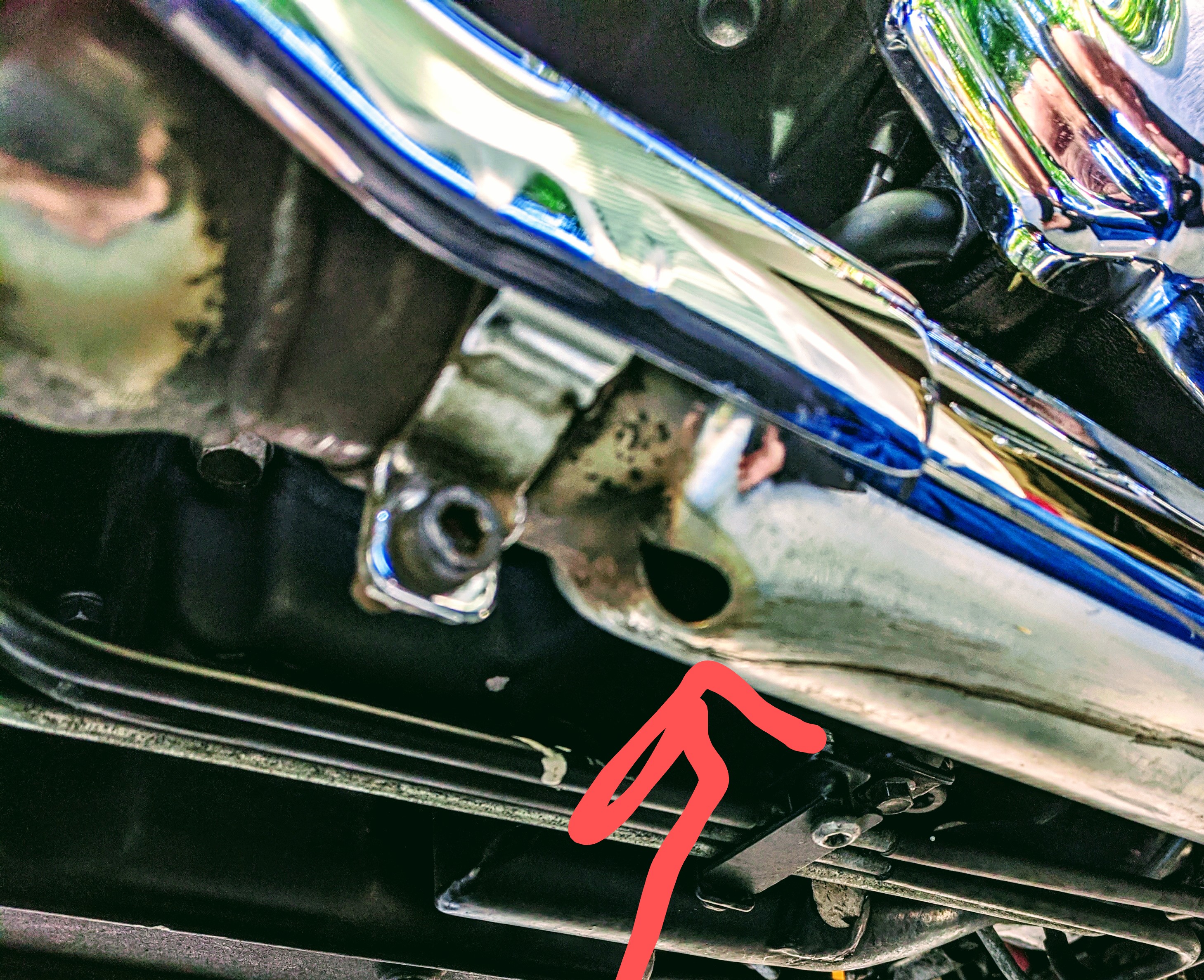 | | Posted : 15 Sep 2020 - 21:31 Post title : Re: Cleaning pulleys and belt (Re: Linkdog) | | | While I was I my back I took a small breather from cleaning the belt and pulley. I was checking for leaks or anything that could be a problem. As I looked at the header pipe I noticed maybe a 3/4 inch pear shaped hole just before the slip in pipe. Now why would that be there on both sides? Dose that add to decel pop?