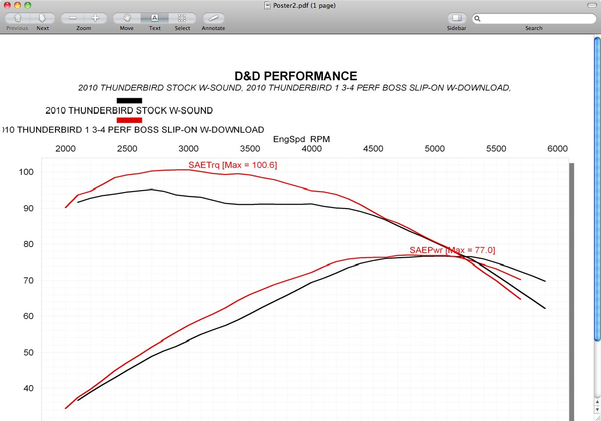 | | Posted : 28 Oct 2009 - 15:47 Post title : Re: D&D Exhaust (Re: STEVEG) | | | Wow....i may have to stare at these a while and hopefully learn to like them ! Thats as much as the BB kit supposedly makes, that is, WITH pipes. can you post the clip? I assume they are cat-less, and it makes me wonder if all cat-less pipes for the Tbird will be equally as gainfull or at least close. I'm trying to like them but that side view just bothers me with that kink in the middle instead of the straight line the stock or tors offer.. The rear-ish view isn't bad tho.