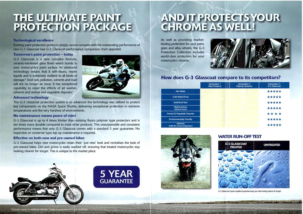 | | Posted : 03 Feb 2011 - 17:00 Post title : Bike Protection | | | I was in my local Triumph dealership today and I noticed a leaflet for G-3 Glasscoat please see below