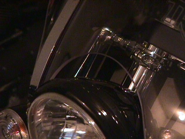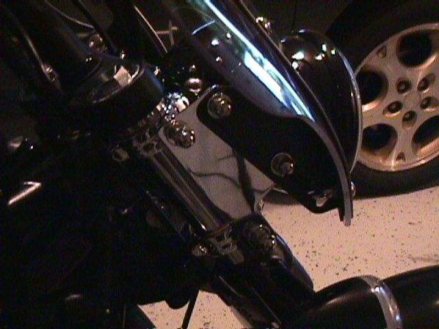 * Take the 4 semicircular fork mounts with the hole for the screws. Using the 1" cap screws (disgard the 3/4" ones that came from Kuryakyn) add lock nuts tightly. * Cut up eight 3/4"x2" (19mm x 50mm) rubber strips. Wipe clean both sides of rubber strips. * Add double sided tape to one side of a rubber strip. Press into semicircular fork mount so that it is centered. Do not extend the rubber to the ends of semicircle -- doing so will spread apart the semicircular halves when mounted to the forks. Repeat for other seven halves. * Clean forks. Fit the 2 pairs of fork mounts to the forks such that they can slide and twist when pushed but not on their own. The cap screws should point out to the side, offset forward. * Fit the sports screen brackets using the 4 regular nuts, hand tight. * Fit the sports screen to the brackets, hand tight. * Making sure the brackets are centered around the dual headlights, I tightened the lower mounts to 1/2" above the turn signal clamps. (I clamped two stiff strips of wood to the sports screen brackets and projected them forward to check for alignment.) * Tighten the upper mounts. * Replace the regular nuts with lock nuts. * Tighten the hardware attaching the sports screen to the brackets. * Use a black (outdoor) nylon cable tie to hold accelerator cables from rubbing brackets. Check tightness after number of rides. That's it.