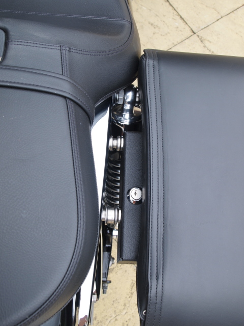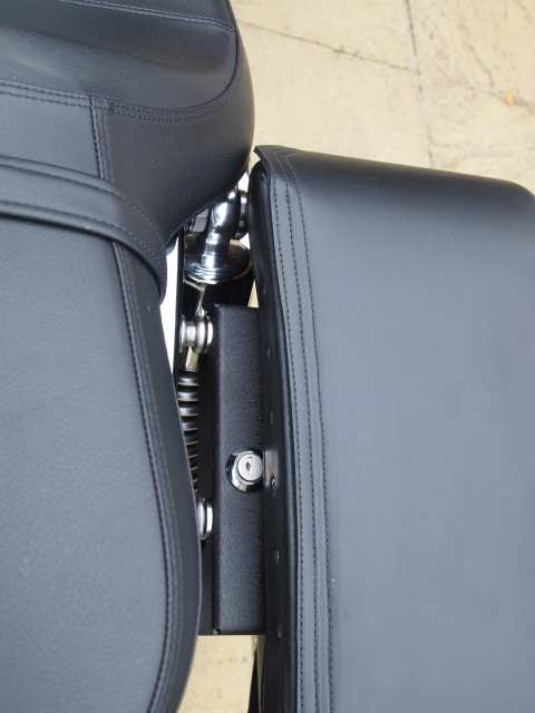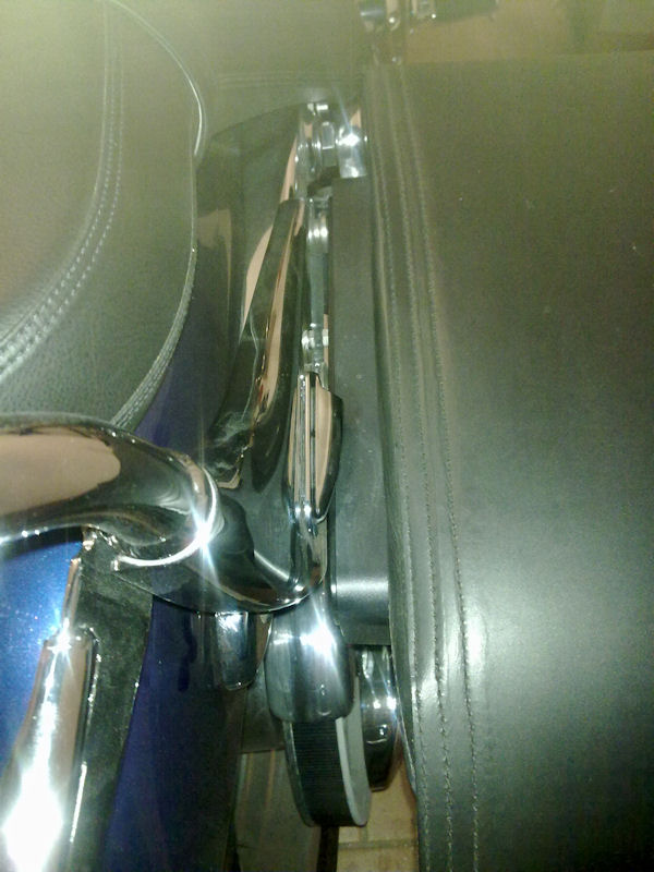 Below, the left pannier is attached using the original Triumph brackets whilst the right pannier is attached via the easy-brackets using just the top 2 screws in the original holes. It's so far forward it's actually touching the seat.