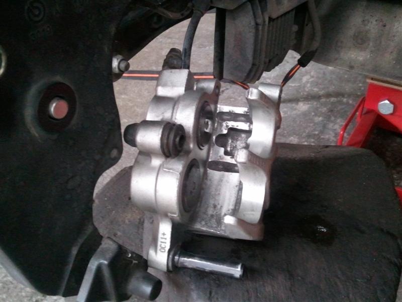 You aren't kidding about the "grow 4 more arms" comment! There was 3 of us working to get it back on and it was STILL a PITA! That tip about wire-tying the caliper in place is a good one, though... having it stay put on the swing arm would have been a big help. For us, the biggest issue was the thickness of the brand-new EBC pads... they are big and beefy and there's NOT a lot of clearance as you try to slide the rotor in between the pads... even when you've got the pistons pushed in as far as they'll go.