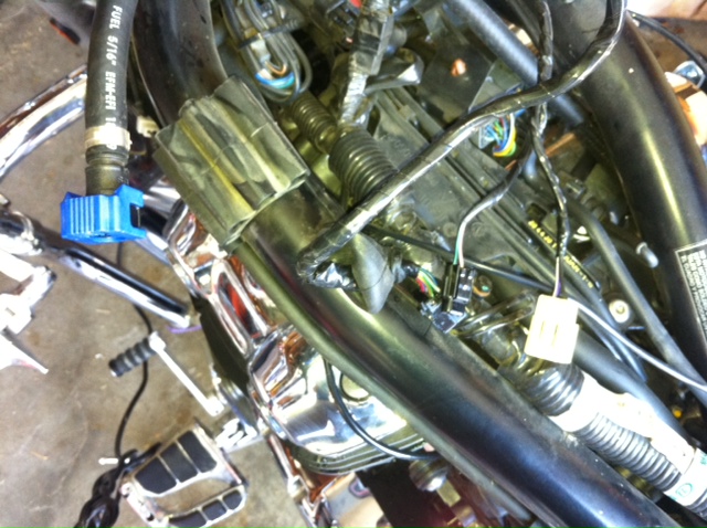 On right are two electric connections. Unlike a lot of computer connections, these pinch at the "top." And the little black one has a piar of little pinchers that pinch in together from the top.. This stuff is hard to see and figure out when you have the tank half up and balanced on the bars. BTW, I'm using the Duece risers, so I always pull the hinge pin first. Then I rest the tank on an old pillow and handlebars.