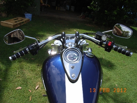 | | Posted : 13 Feb 2012 - 01:47 Post title : Thunderbird Fitted With Storm Risers and Handlebars | | | Have removed the TT bars and now fitted the Storm Risers and Bars. The TT bars were a little high for me and gave no adjustments at all. On the other hand with the Storm Risers and bars I can now raise or lower the bars to just the right setting that eases any shoulder and neck pains. All in all a very good changeover ,the cables and brake lines do not need changing at all,the only problem I encountered was with the tightening of the risers . No matter how tight I turned the bolts the risers would not tighten all the way up,I used the Storm bolts ,as they are longer ,I eventually had to use the small chrome brace bar that comes with the TT set ,it cured the problem and the risers are now rock solid. Others looking for a replacement for the TT bars can certainly look at these. Will road test them this week and let you know the results.
