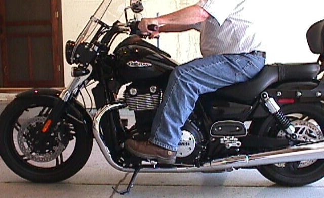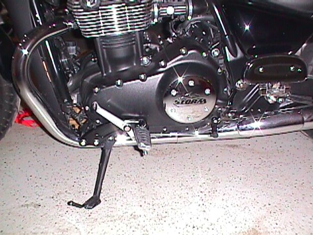 I rode the bike and having the footpegs 4-1/2 inches closer to the rider is GREAT. I sparingly used the rear brake because of the lack of a return spring. Putting the kick stand up will take some practice as the left footpeg is more in the way.