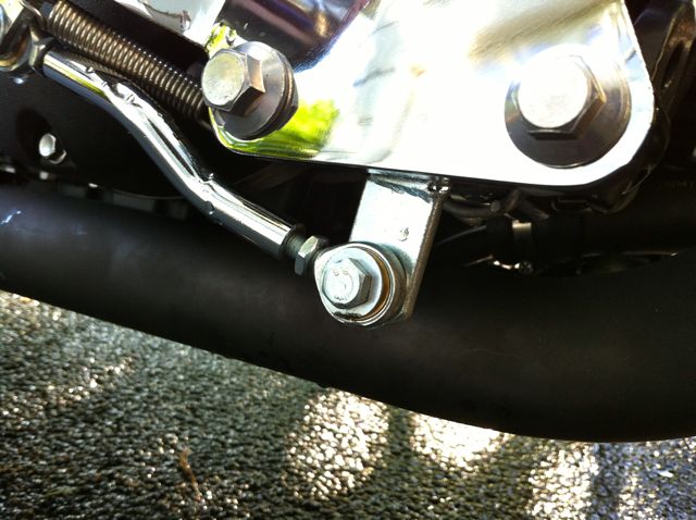 The OEM control plate assembly attaches to the engine bracket. It then bends out 20mm at the footpeg attachment point to clear the alternator cover.