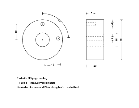 I'm attaching a pdf of the new spacer, measurements in mm. (Print with no scaling, it should print to scale.) Again 20mm in length. Same inside diameter. 46mm outside diameter. Added would be two 4mm diameter holes 18mm from center, 85 degrees apart. The stopped hole would take the OEM brake pedal return spring and the through hole would be used to attach to Discacciati clevis-pin lever. I would drill a hole in Discacciati's lever and pin the parts together.