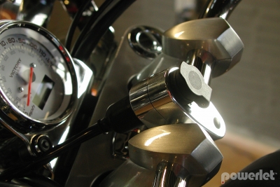 I put my Powerlets Power Bar on today .... it's chrome as well ... more shiney sh*t Just in case you don't know what I'm talking about ... it's one of these. You pop a Ram ball in where the plastic cap is and hey presto Satnav and iphone mount.