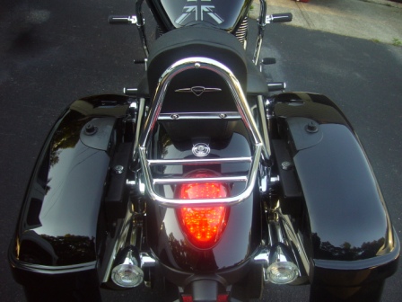 Is anyone aware of an aftermarket sissy bar, or one from another manufacturer, that will fit the quick release unit and rack? I have a large Leatherpros trunk (Link attached to my rack. The standard Triumph backrest angles back to the rear, blocking much of the rack. I would like a straight sissy bar - without the bend - to allow full use of the rack. While the trunk currently fits, a sissy bar that was further forward would expose more of the rack and better support the trunk. Most importantly, my wife's comfort would be improved - she doesn't like leaning back so far, and often finds the pillion bolt biting her arse, and neither of us wants a touring seat. |