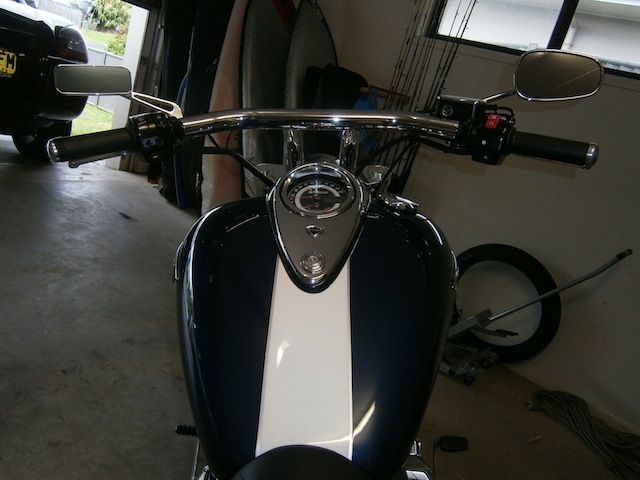 Well I had my heart set on a pair of Rizoma Senso mirrors to replace the massive (but practical) standard mirrors but at $400 Australian they were way to dear for me . For those that aren't familiar with these mirrors, check out birdy68 pics. They look unreal. So any way I found a pair of cheap mirrors on ebay for $60 delivered. They arrived within a week from Thailand and were gift wrapped with a personal hand written note. I haven't experienced customer service like this before over the net and didn't expect it coming from Thailand. The only thing better would have been a massage with a happy ending. The mirrors come with an assortment of bolts so that they will fit a variety of bikes. All I had to do was make a rubber bush / grommit out of an old spear gun rubber to take up the slack around the bolt within the switch housing. Yeah the new mirrors are way smaller and lower than the standard ones and I can already here all you old blokes saying how they are not practical and you actually want higher bigger mirrors but I don't like the look of riding around with a couple of bathroom mirrors strapped to my bars so I'll give these a run. I thought at $60 its not a bad risk to take. I would hate to spend $400 on Rizoma and then realise they are to small. Below are some pics (sorry about the quality). See what you reckon. If you want to check them out on ebay you can search for "Chrome mirors aluminum 10mm for motorcycle chopper cruiser racer KiWAV Magazi"
