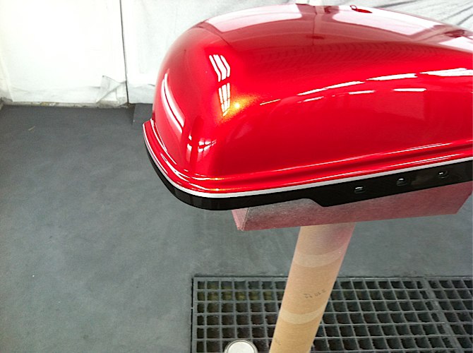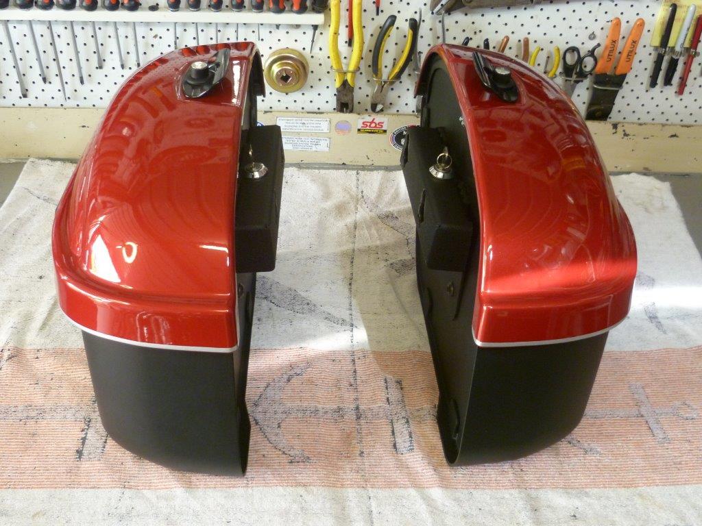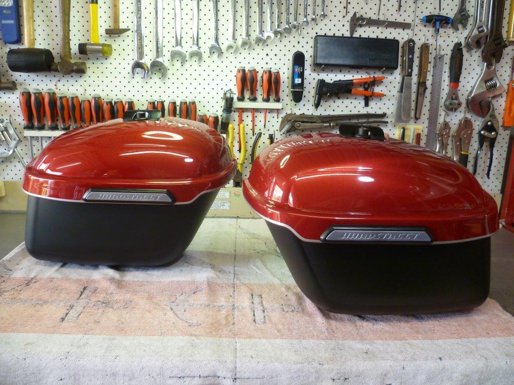 | | Posted : 23 Mar 2013 - 00:10 Post title : painting extras | | | thought i would explain what i did when i painted my slim bags here goes: first i got the hard street slim bags as primed units through fast eddy. bags are mounted with easy brackets took the bags apart and sanded with 600 grit sand paper and scuffed with red 3m scotchbrite pad inside of bags were masked off and PPG sealer was appiled , dark grey. Standox triumph code pr phantom black was appiled to bottoms and lids lids were masked off as to leave a small strip of black on the bottom of lids 3 coats of silver was applied to lids on remaining area , the silver was the ground coat for Duponts HotHues apple red custom colors 6 coats of the dark maroon mid-coat was then applied ,note a small stripe of silver was taped off next to the black on lid next 2 coats of PPG clear was applied the next day all 4 pieces were sanded with 1000 grit and 2 more coats of clear was applied here's the results