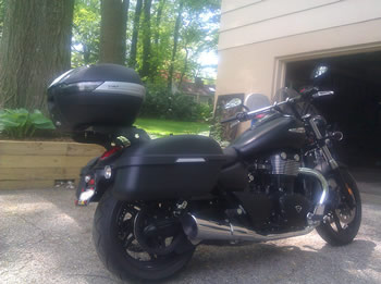 | | Posted : 10 May 2013 - 18:28 Post title : Re: Oh yeah... Ordered Up a Rack and Top Case (Re: bnz433) | | | Oh man, I wish! Maybe someday. Hey if I could leave for Bennington today you know I would! The topcase comes off in a millisecond leaving the universal mounting plate and luggage rack/racing spoiler behind. The bags are your typical easy bracket setup - which in my experience is not quite as easy as it could be - but still takes just a few minutes of key jiggling. My plan is to put stuff that I want quick access to on the road e.g. snacks!, rainsuit, maps, other gear, cleaning supplies in the left bag, clothing in the topcase for convenience going in and out of hotels, and whatever/overflow/souvenirs/beer/weed (just kidding!) in the right bag.
