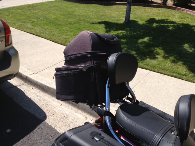 | | Posted : 18 Aug 2013 - 18:34 Post title : Re: Need a sissy bar bag- suggestions? (Re: hogeyphenogey) | | | I had a Kuryakyn Classic Tour which just strapped on. I wasn't large enough for a helmet and other gear so I got the Kuryakyn Gran Tour. For this, I just unscrewed the sissy bar pad and ran a strap behind it. I gave the Classic Tour away but this picture shows it sitting on top of the Gran Tour.