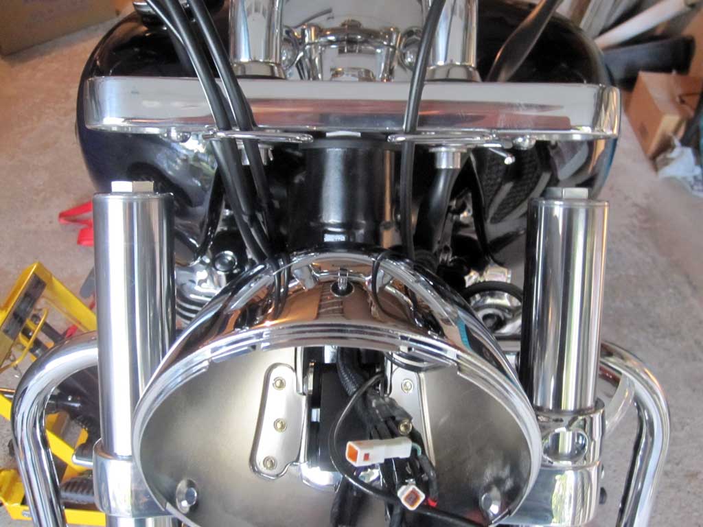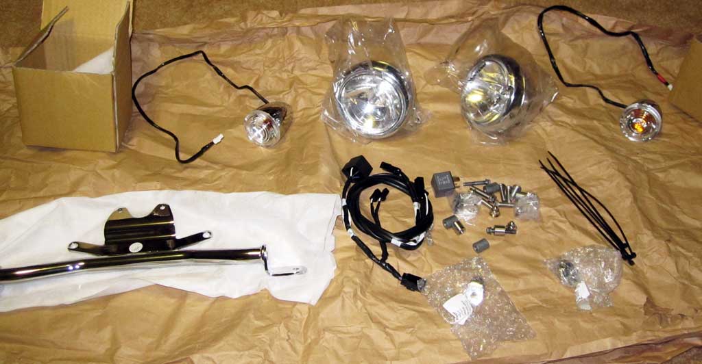 The two turn signals in the photo aren't supplied, they're what's left of the stock signals after they're removed from the forks and disassembled. Removing the front signals wasn't fun but could have been worse. Instead of following the directions and removing the brakes, wheel, and lowering each fork, I just jacked it up a little, opened the triple clamps and gently dropped the forks, wheel and all. Well maybe not exactly gently, since you're dealing with both forks still connected to the wheel they took some coaxing, a little at a time, so if you do it this way, make sure you've got your Bird firmly secured to the lift.