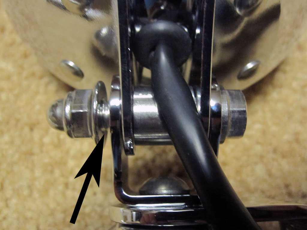 2) The bolt supplied to attach the new lamps to the bar bracket ends is too long for the domed type of nut supplied. It doesn't even come close to the bracket. The supplied bold is 35mm, probably should be 30mm. I made a spacer out of washers to allow the nut to tighten lamp bracket connection. The photo below shows the fully tightened nut.