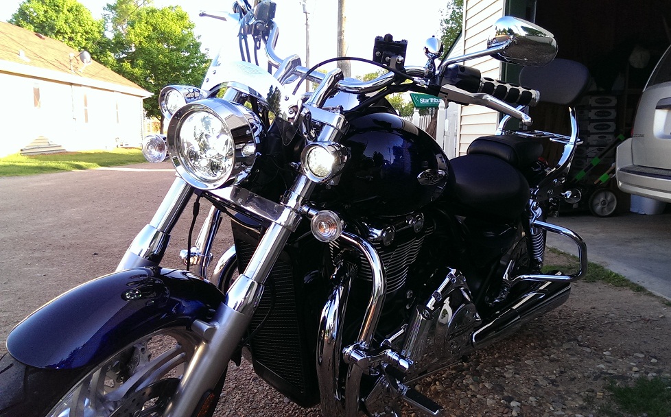 BTW, the driving lights are fork mounted Kuryakyn LEDs. They are a nice addition as well and their color/temp matches well with the Daymaker.