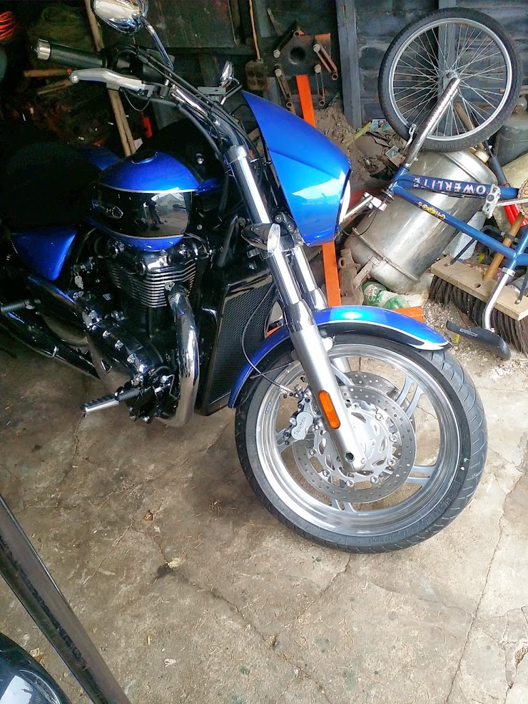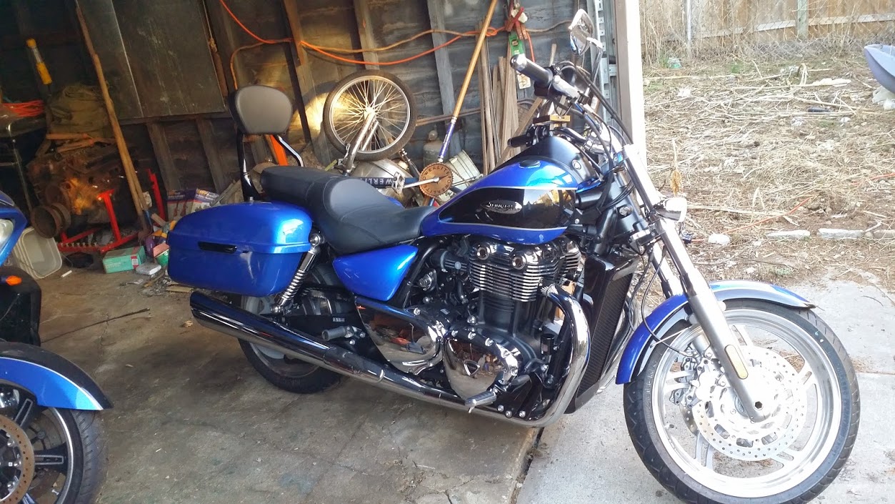 | 2013 Thunderbird ABS Caspian Blue and Black Meercat crossover, D&D slipons, Black Wrapped Pipes, K&N air filter, Avon Grips, Hardstreet Slimline bags, Long haul dualseat, QR Sissy Bar 2012 Victory Cross Country Tour World Rally Blue Pearl and Obsidian Black Pearl