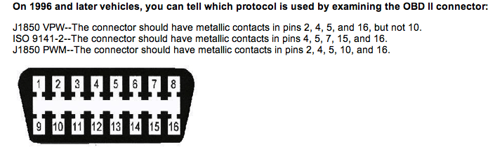 Ah yes, thanks Ted, forgot that ABS has additional sensors. That might make a difference in OBD2 port pins, or maybe pins 1 and 9 are both ground? Haven't found a pinout for this connector in our manual yet, might be in circuit diagrams. (DTCs are in Fuel section, 10-30.)