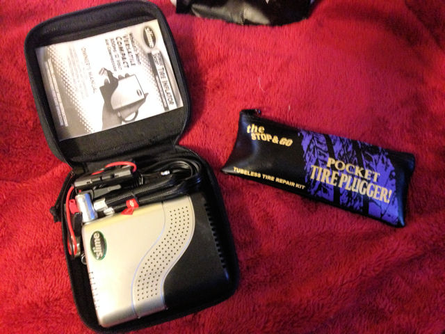 | | Posted : 22 Apr 2014 - 15:28 Post title : For sale: Slime air compressor and tire plug kit | | | I sold my bike so I no longer need these. I have a SLIME 12v air compressor that's in a zipper case. It's only about 6 1/2 " square and 2 1/2" thick. Plugs into your 12 v lighter socket. Also have a Pocket Tire Plugger kit. Great for roadside repairs. This kit is in it's own zipper case. It puts the type of plugs in that look like they have a nail head on them. Best plug to use. The nail head end of the plug actually goes inside the tire making a perfect seal. Both will fit in your side bags just fine!